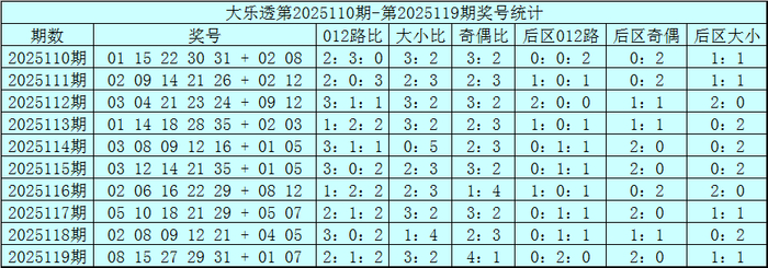 体彩大乐透第25119期奖号为:08 15 27 29 31+01 07,前区奖号012路比为2:1:2,奇偶比为4:1,大小比为3:2,后区为全1路号码。