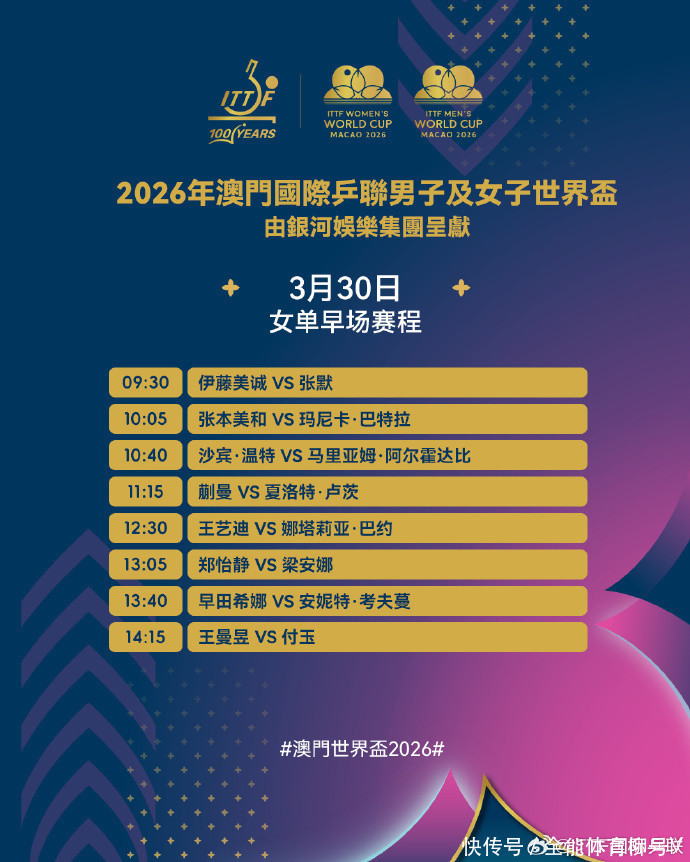 北京技巧3月30日音书,2026年海外乒联澳门全国杯将至今天认真拉开帷幕。女子单打小组轮回赛首个比赛日,全国第一孙颖莎、全国第二王曼昱鉴定势出战,她们的首秀敌手是中国台北选手李昱谆、葡萄牙选手付玉。